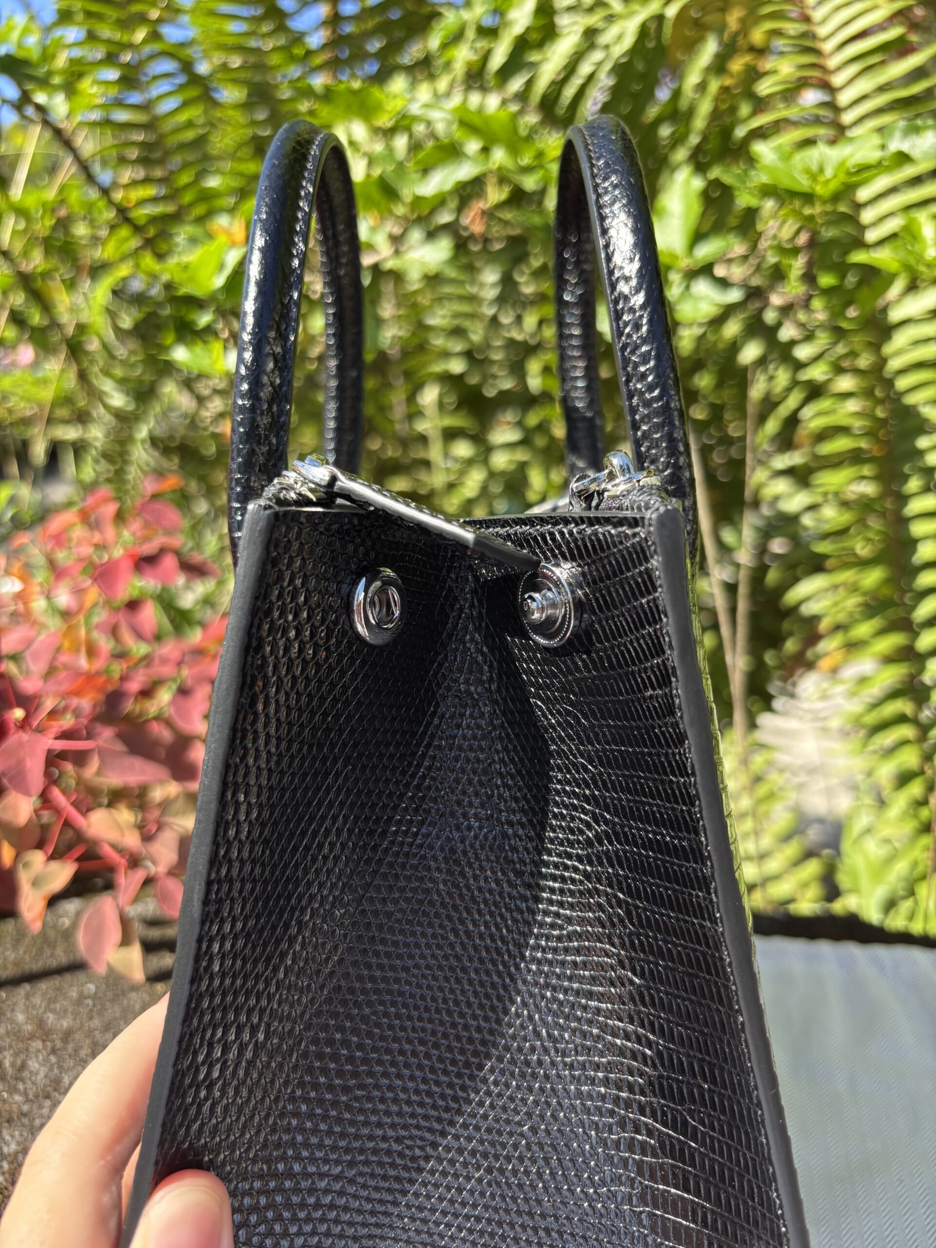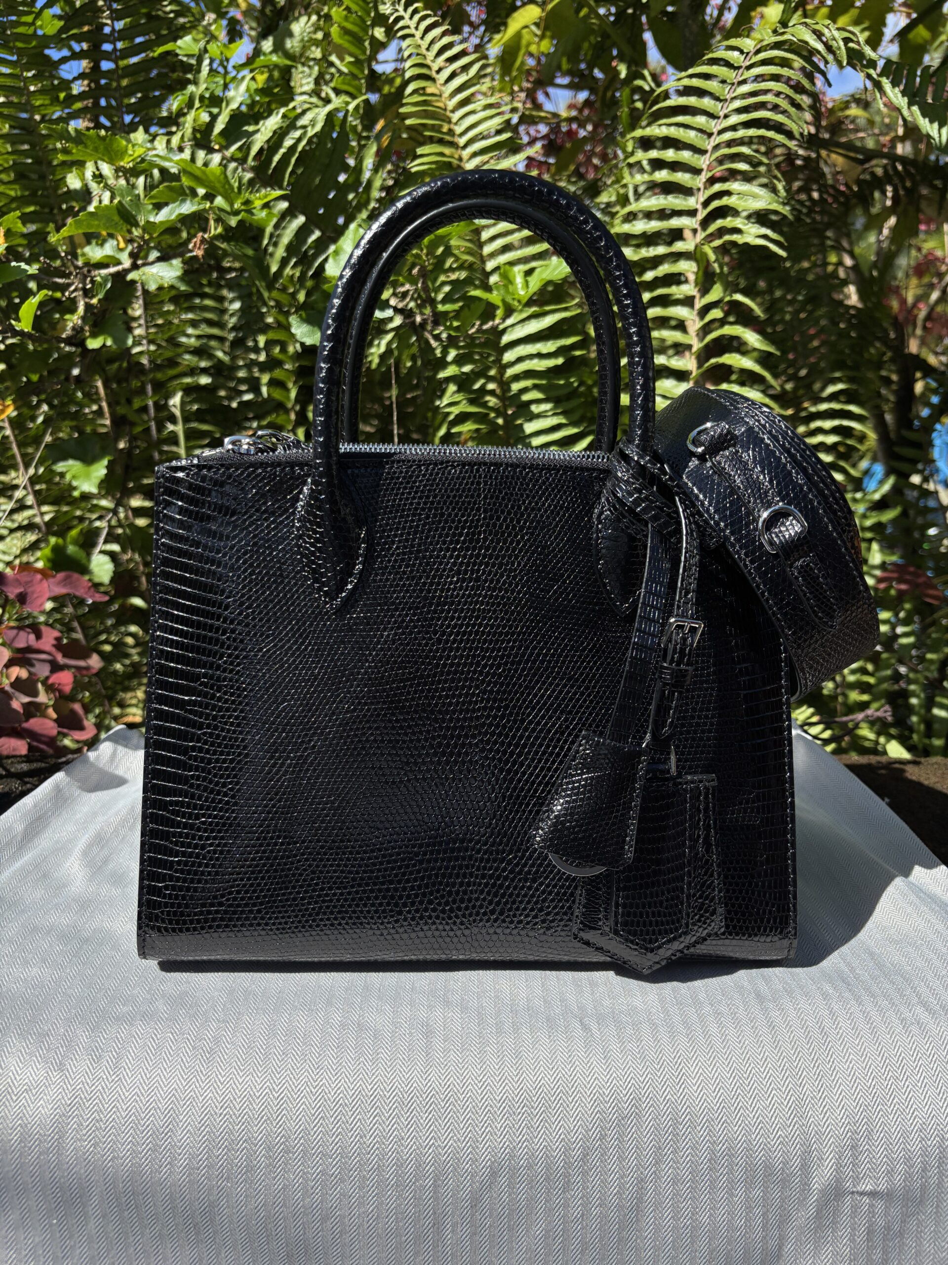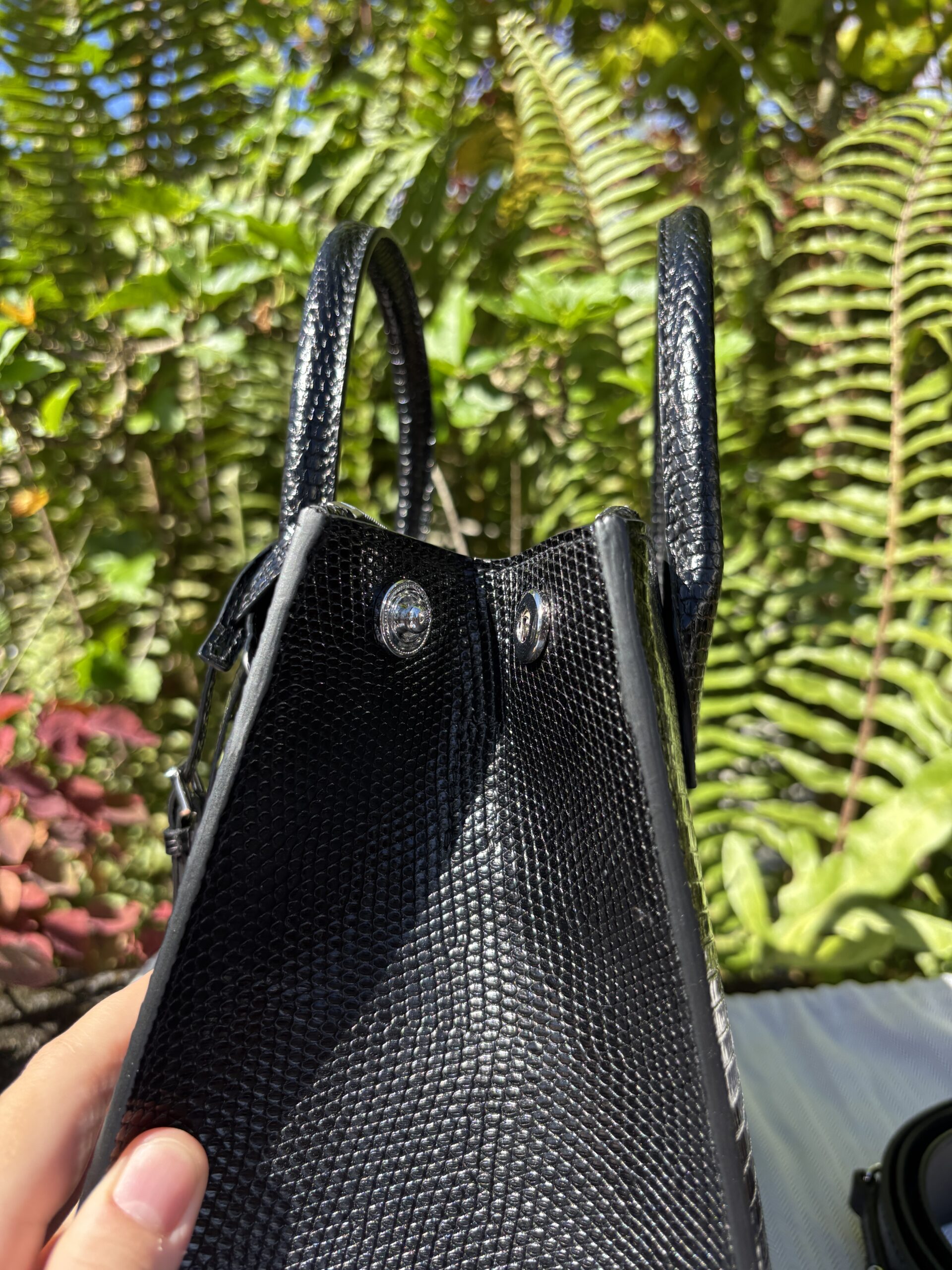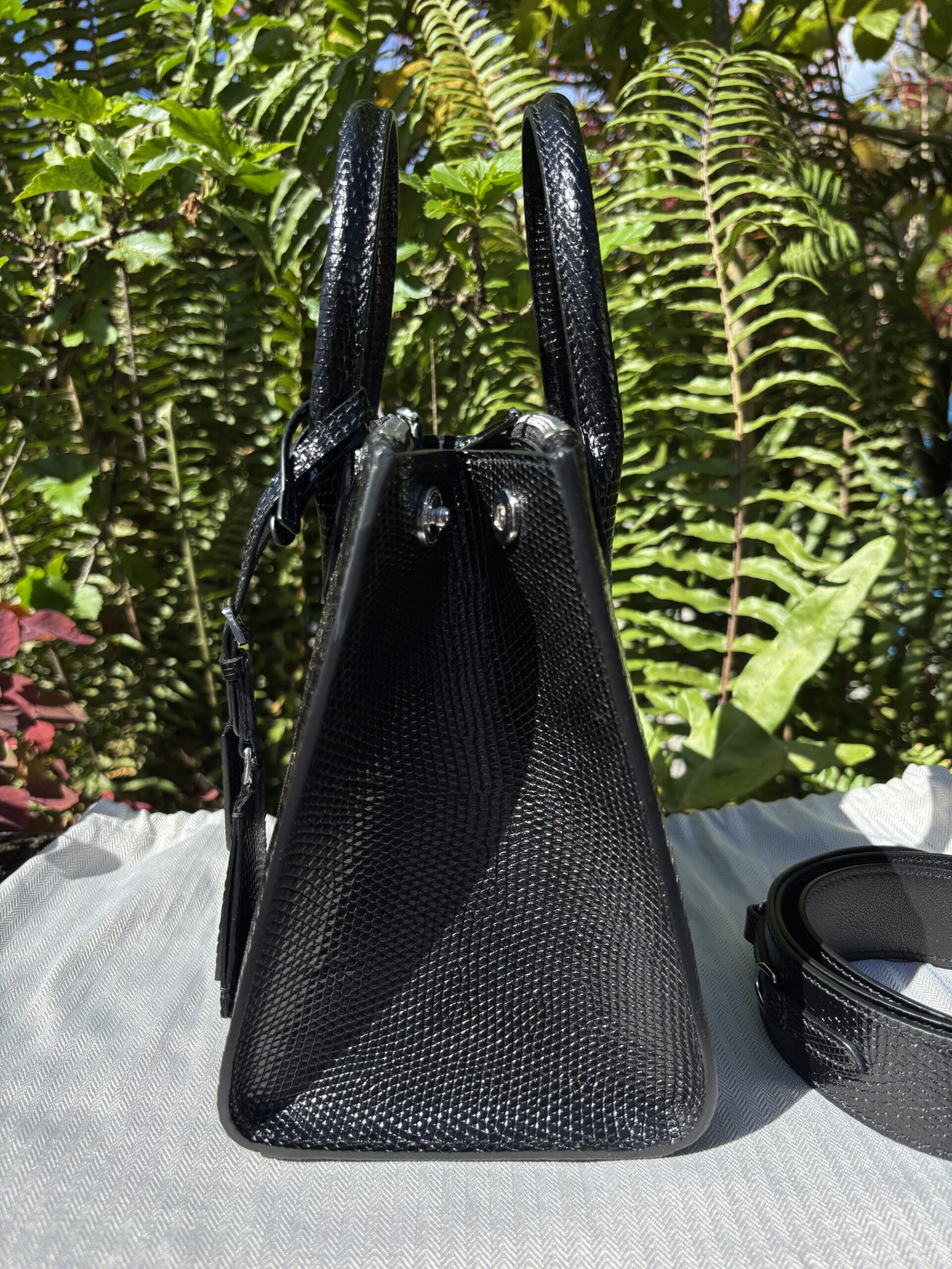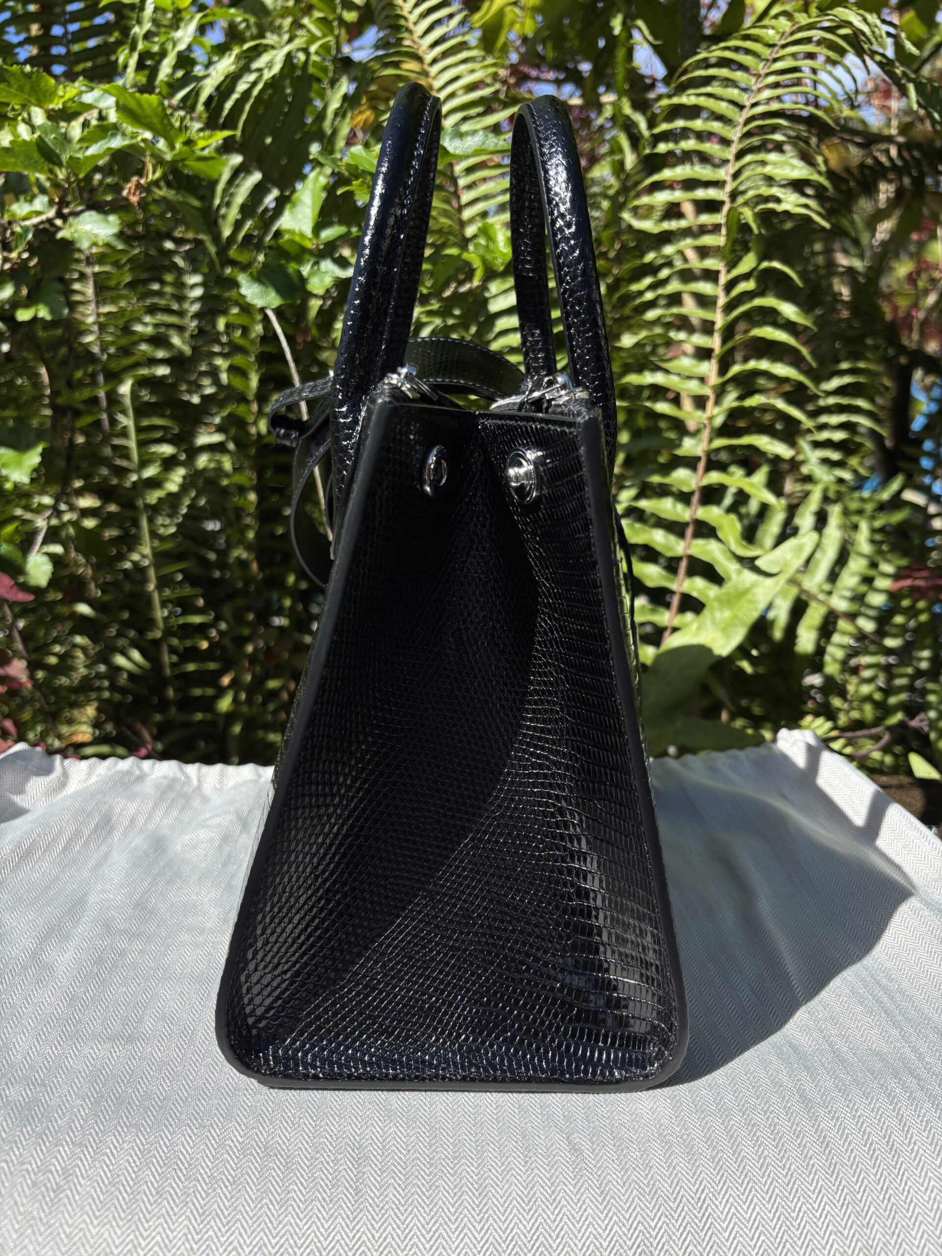 This Custom Made Lizard Leather Tote Bag is exclusively for sale by Meme’s Treasures. The approximate measurements of this item are 10 x 5 x 8. The shoulder strap drop is approximately 16 inches, whilst the handle size is approximately 4.50 inches. This item has metal hardware with a silver finish. This Custom Tote Bag includes a shoulder strap. This Tote Bag includes a dustbag, and does not include a box.