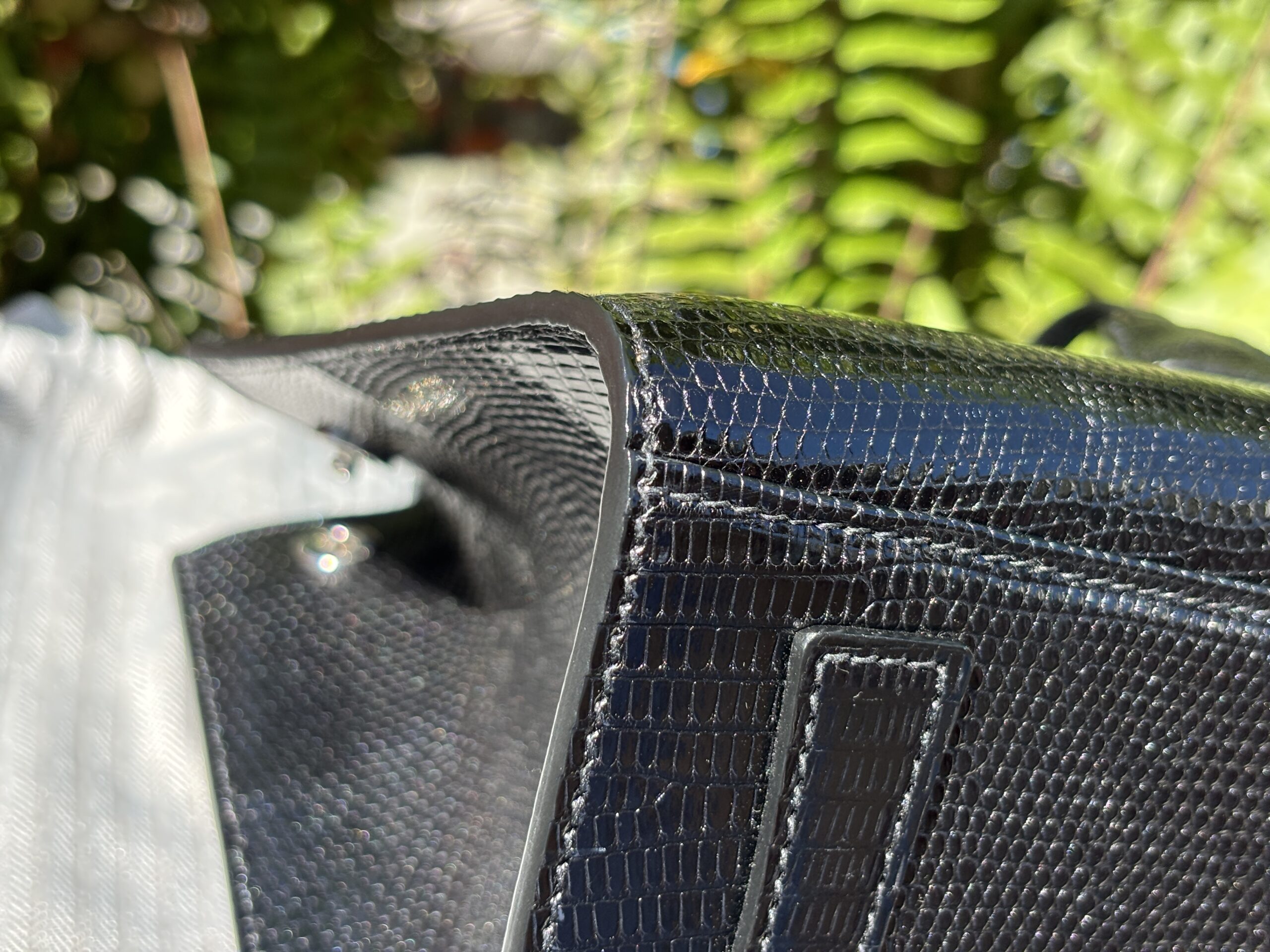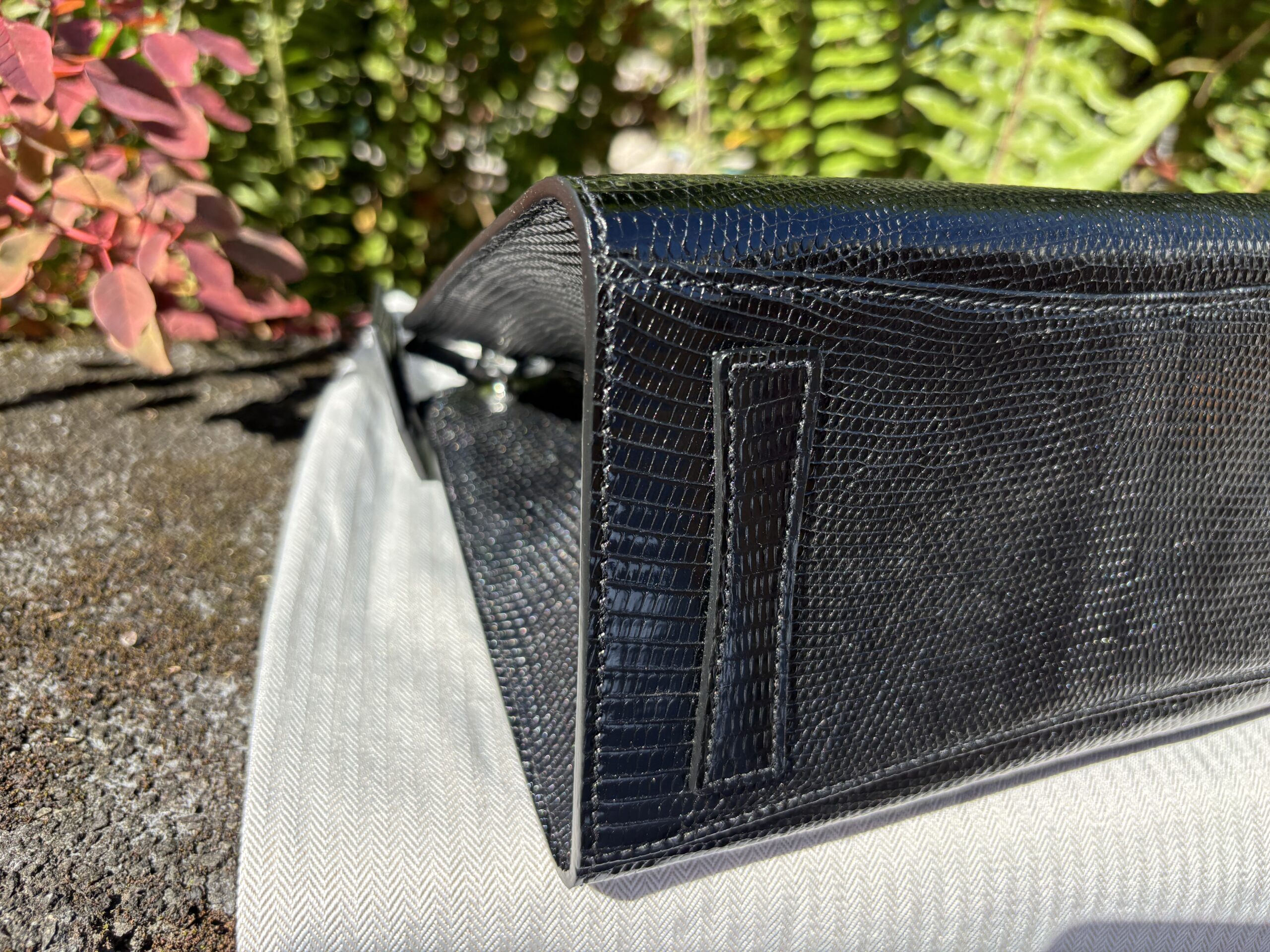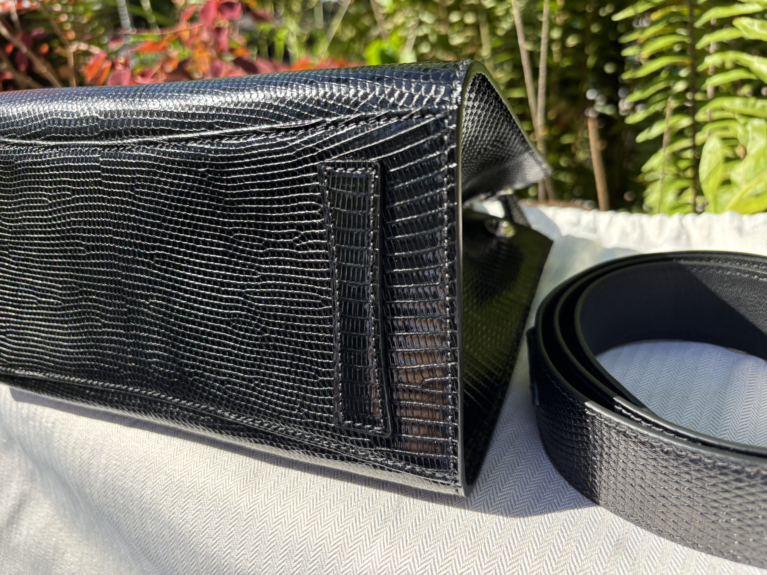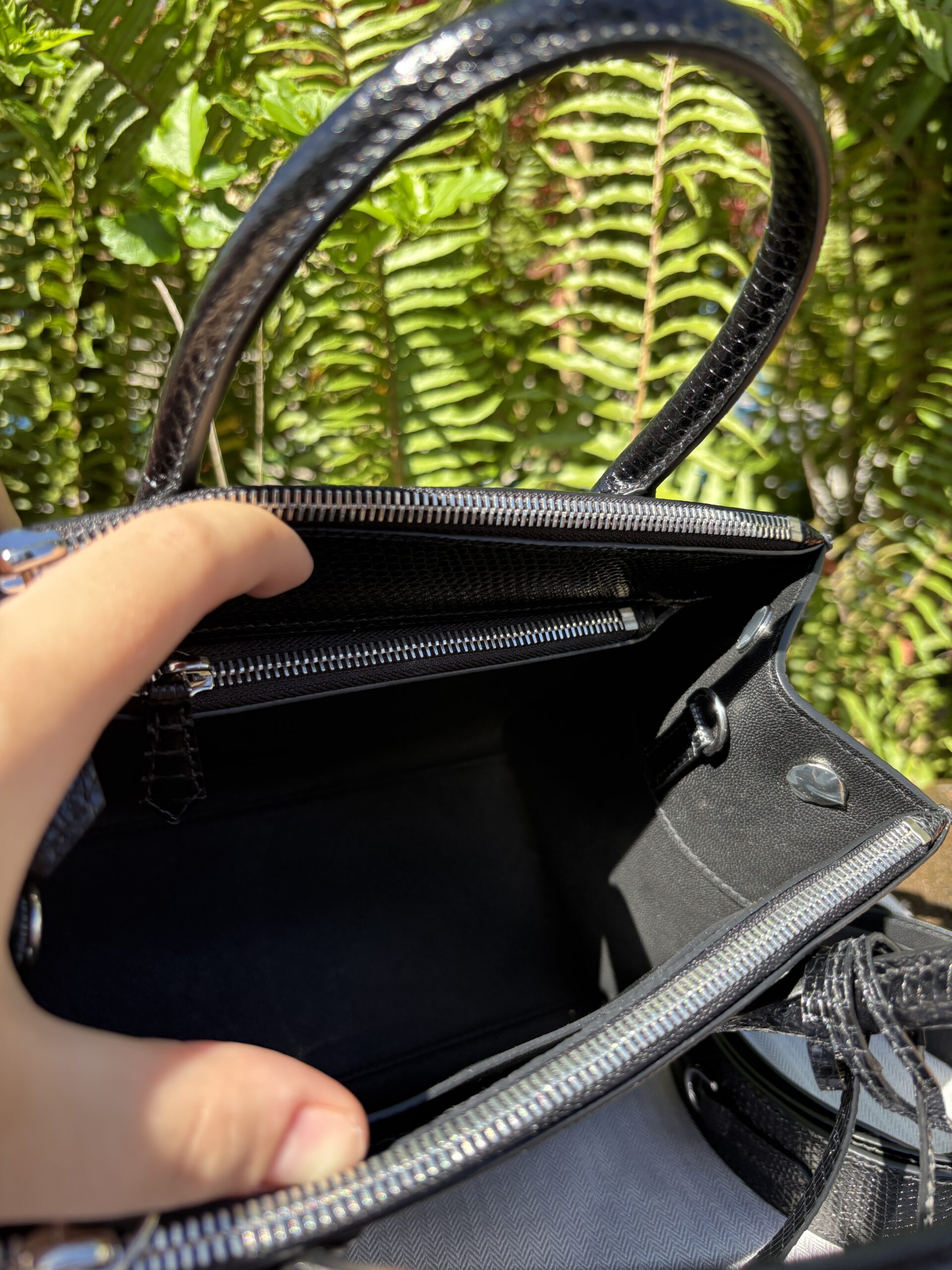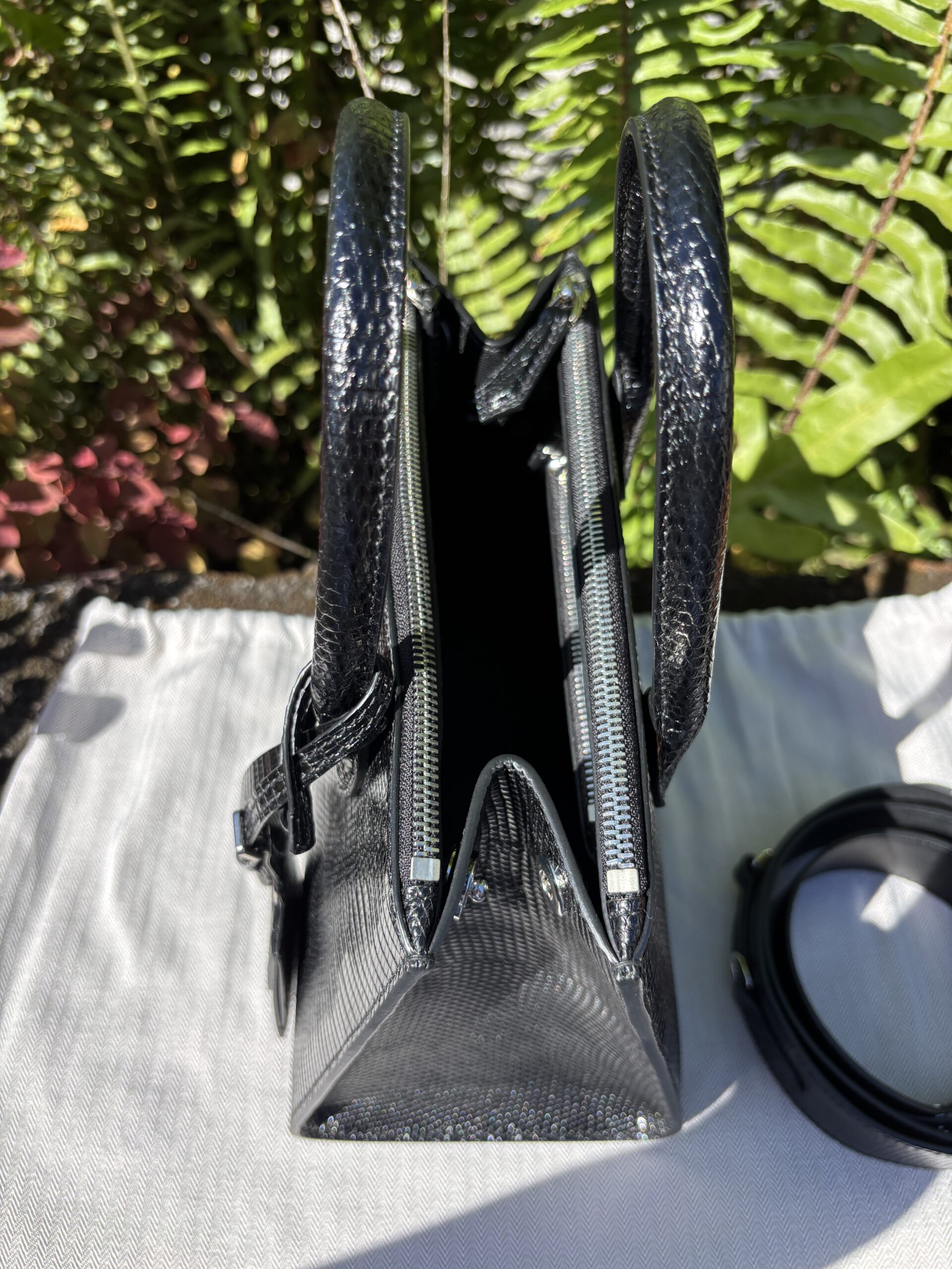 This Custom Made Lizard Leather Tote Bag is exclusively for sale by Meme’s Treasures. The approximate measurements of this item are 10 x 5 x 8. The shoulder strap drop is approximately 16 inches, whilst the handle size is approximately 4.50 inches. This item has metal hardware with a silver finish. This Custom Tote Bag includes a shoulder strap. This Tote Bag includes a dustbag, and does not include a box.