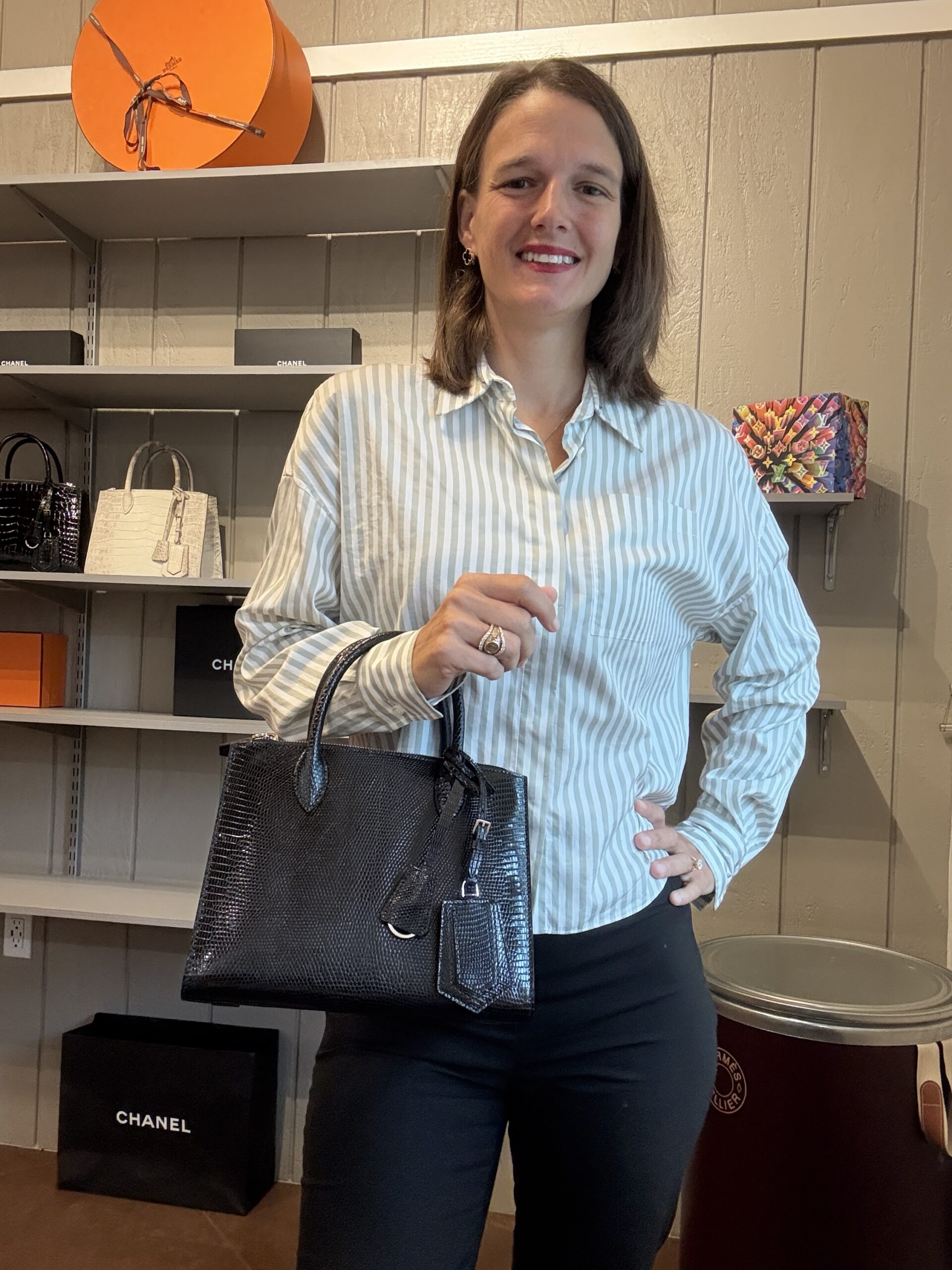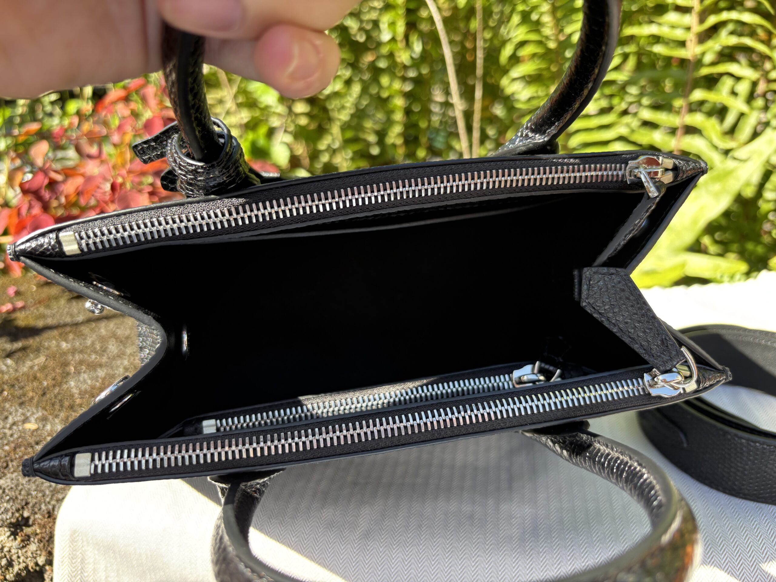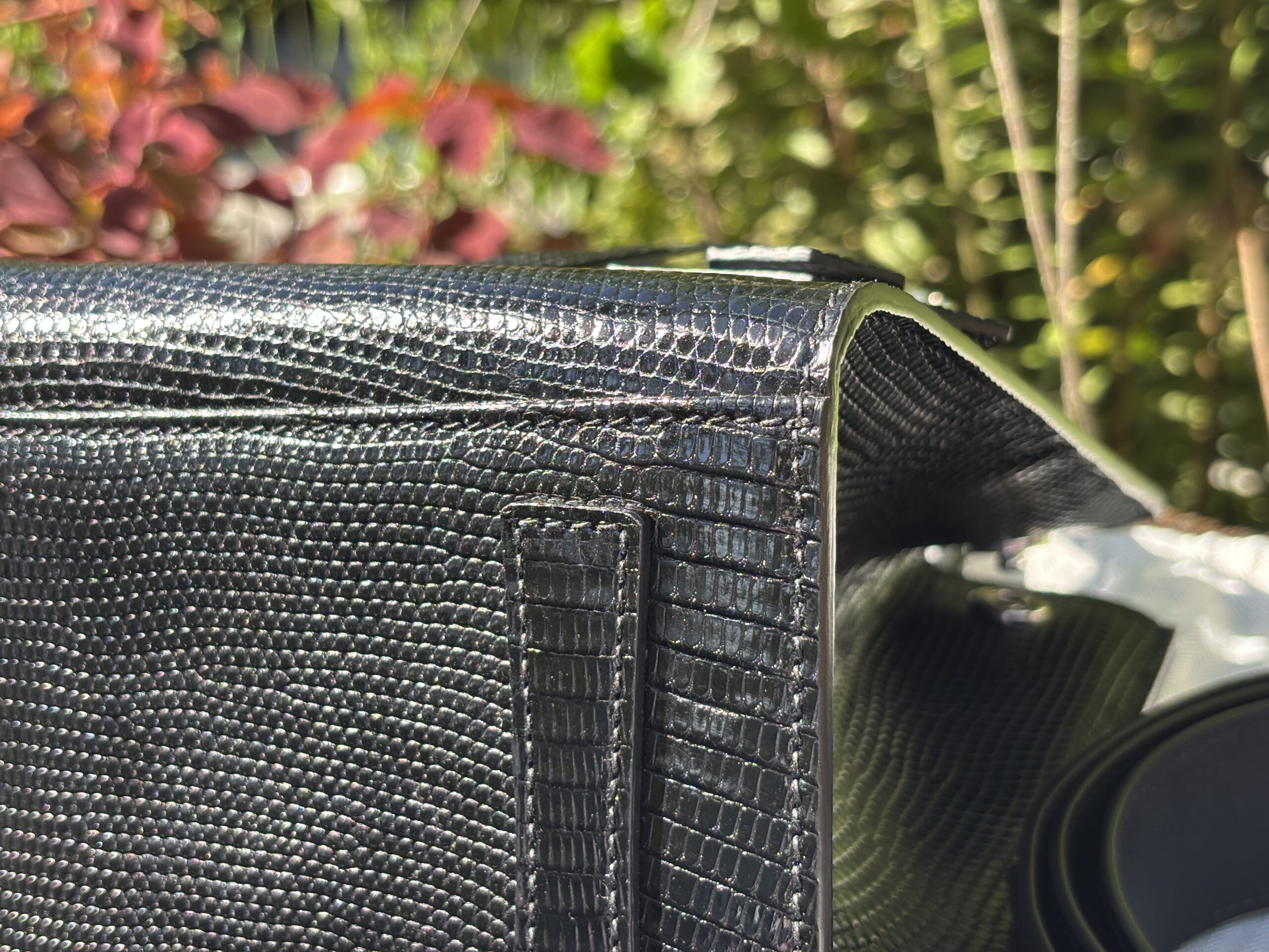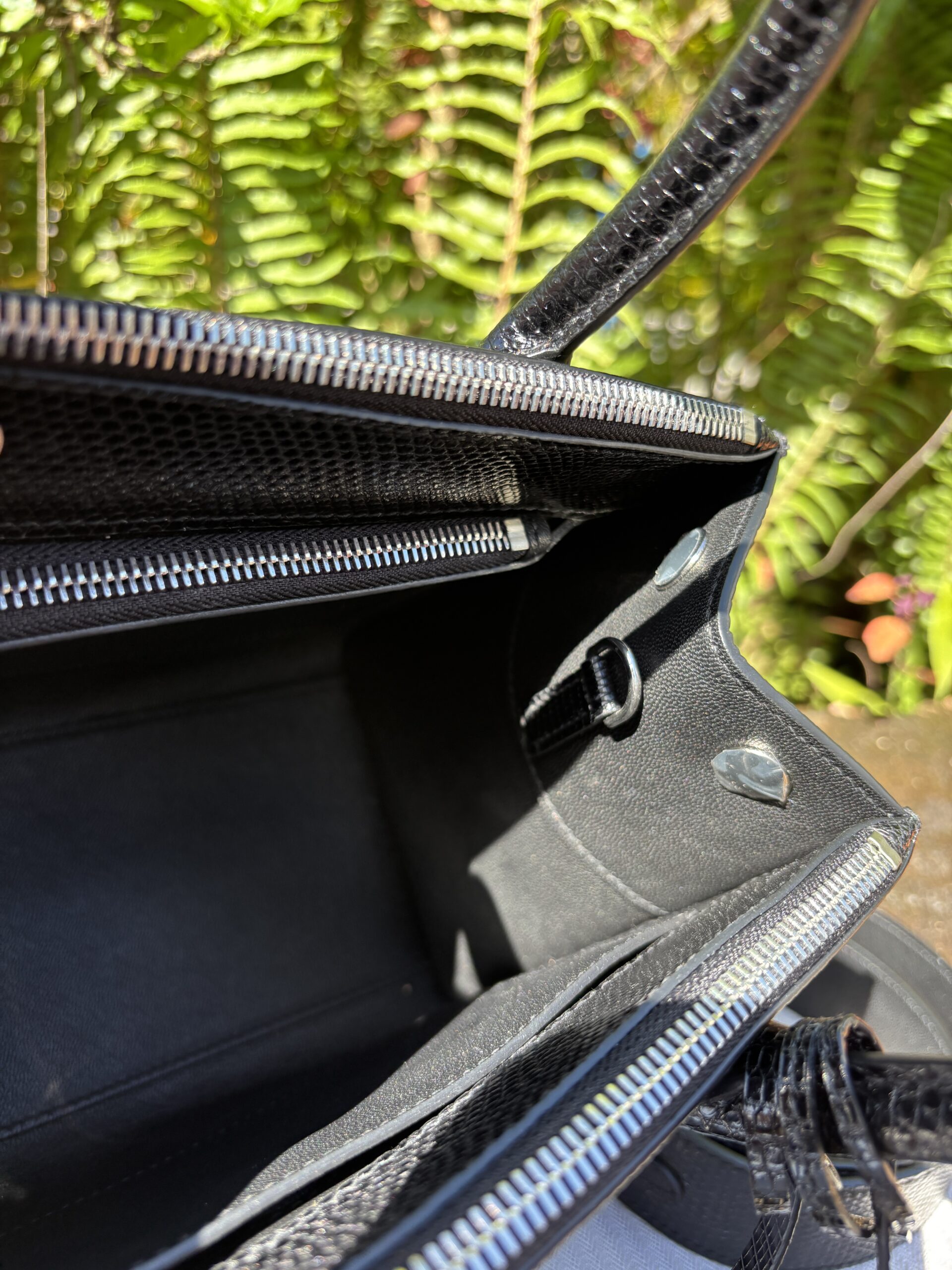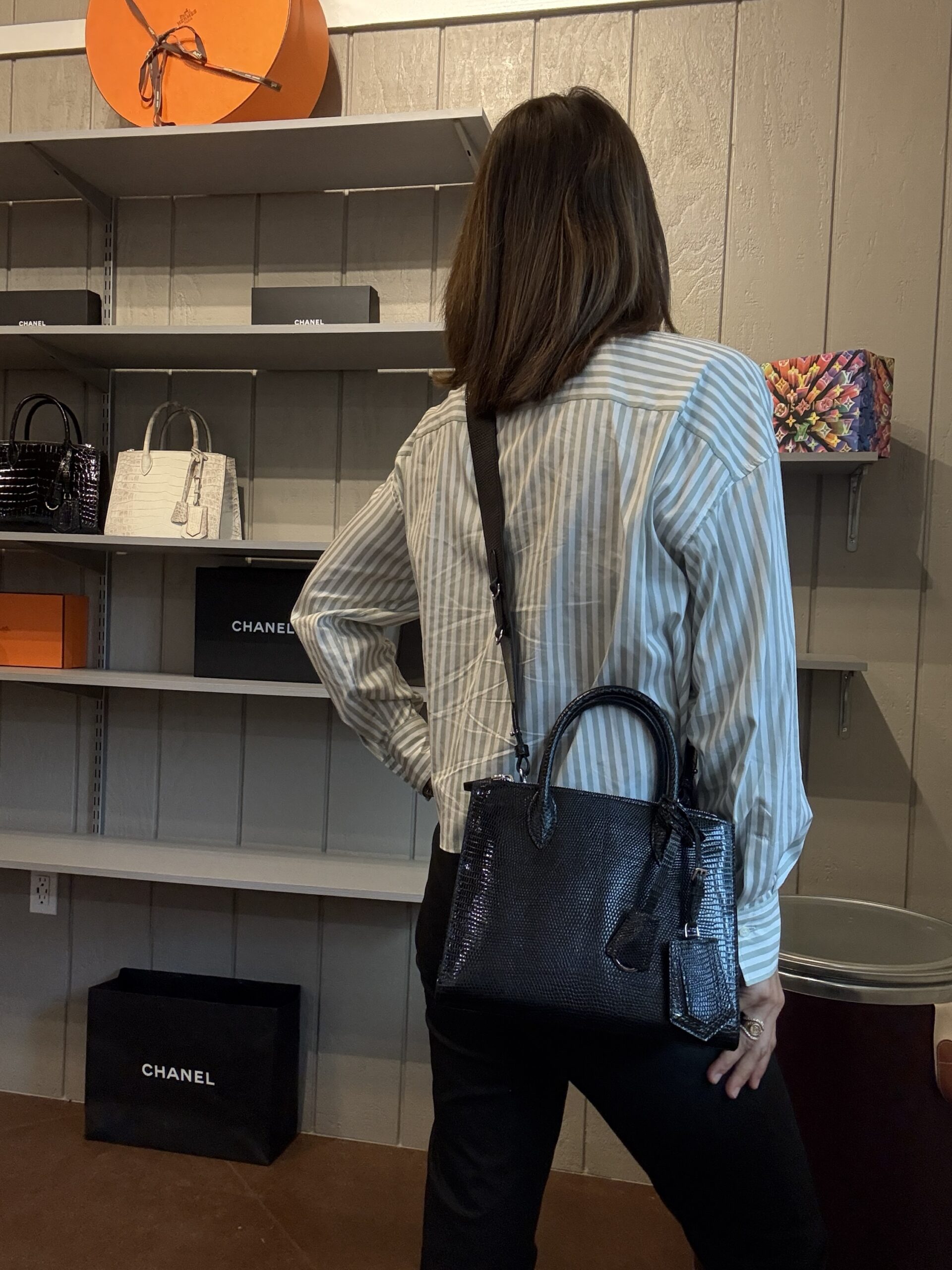 This Custom Made Lizard Leather Tote Bag is exclusively for sale by Meme’s Treasures. The approximate measurements of this item are 10 x 5 x 8. The shoulder strap drop is approximately 16 inches, whilst the handle size is approximately 4.50 inches. This item has metal hardware with a silver finish. This Custom Tote Bag includes a shoulder strap. This Tote Bag includes a dustbag, and does not include a box.