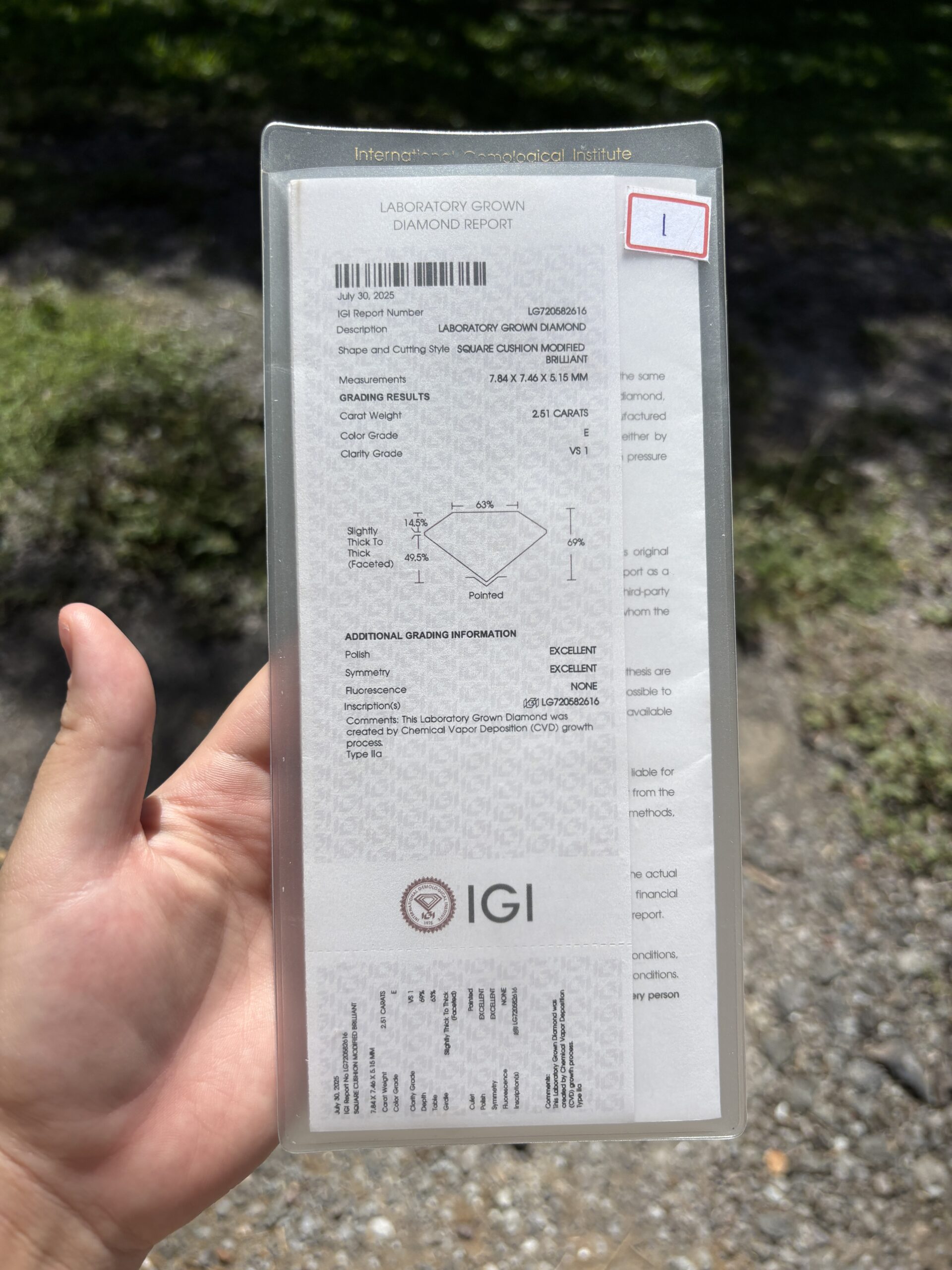 Uncover the brilliance of refined elegance with this 2.51 carat lab-grown cushion cut diamond from Meme’s Treasures. Graded E color and VS1 clarity, it radiates a near-colorless purity that rivals even the finest natural diamonds.